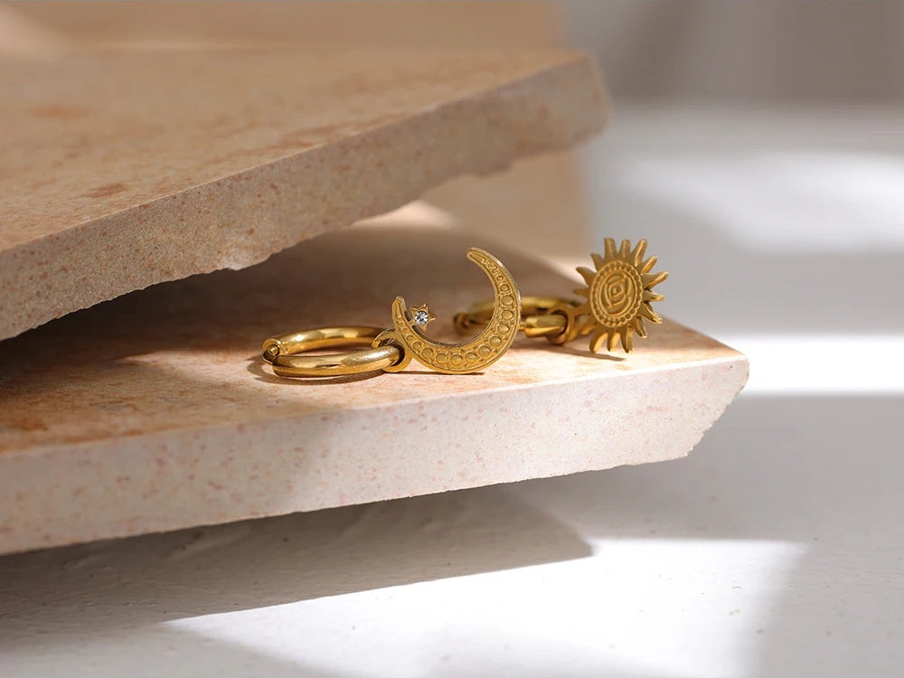 Crafted from durable stainless steel with a sleek gold-colored finish, these asymmetrical hoop earrings feature distinct star and moon charms with textured detailing. The lightweight design ensures comfortable wear, while the secure hoop closure adds ease and reliability. Ideal for those seeking a modern, geometric accessory that blends trendy style with everyday versatility.