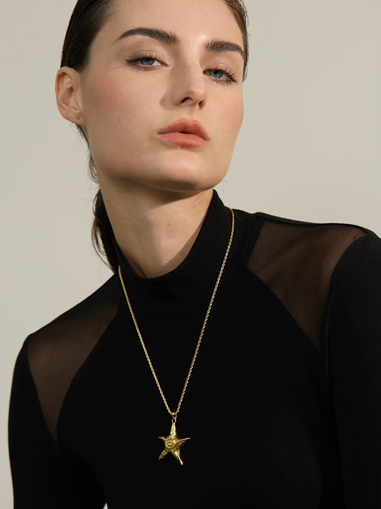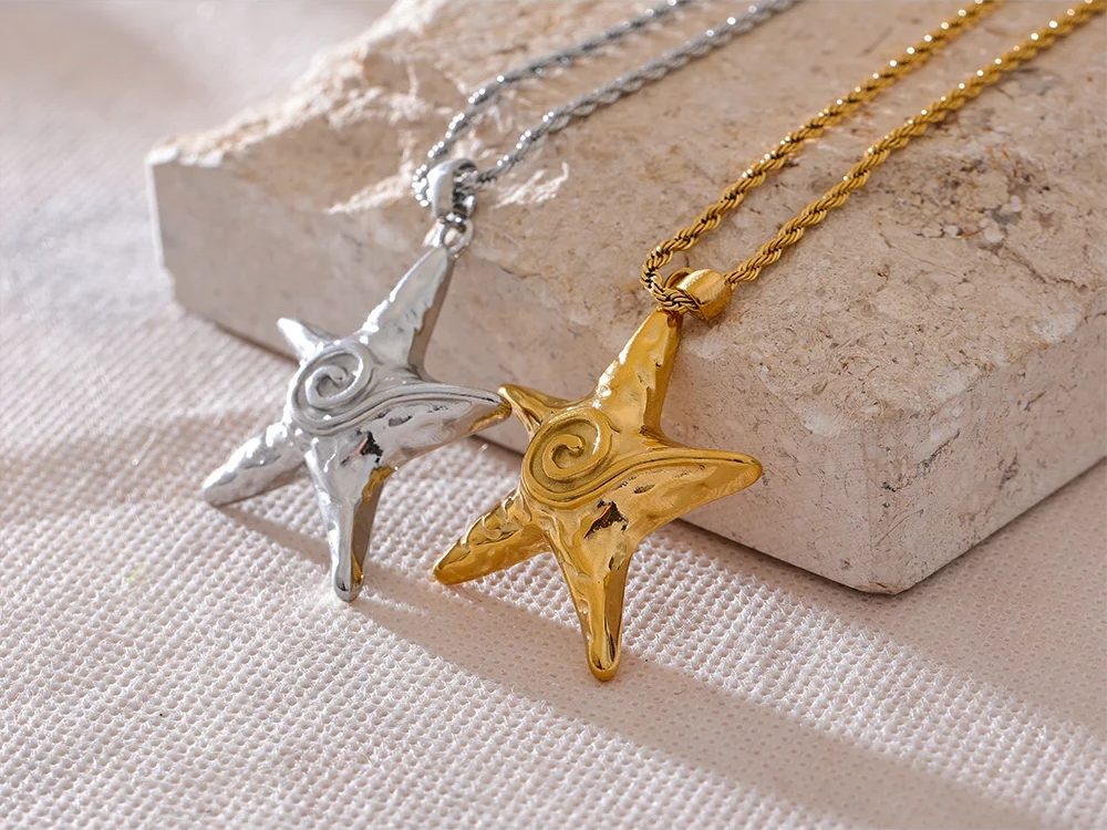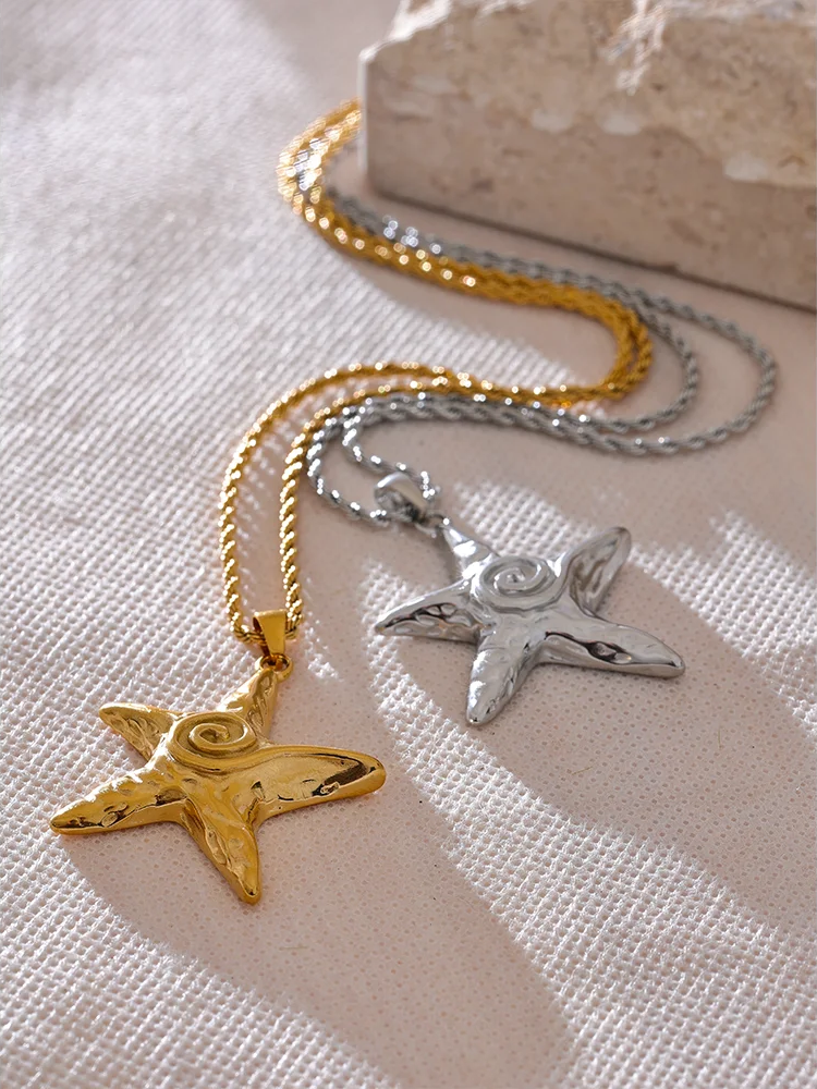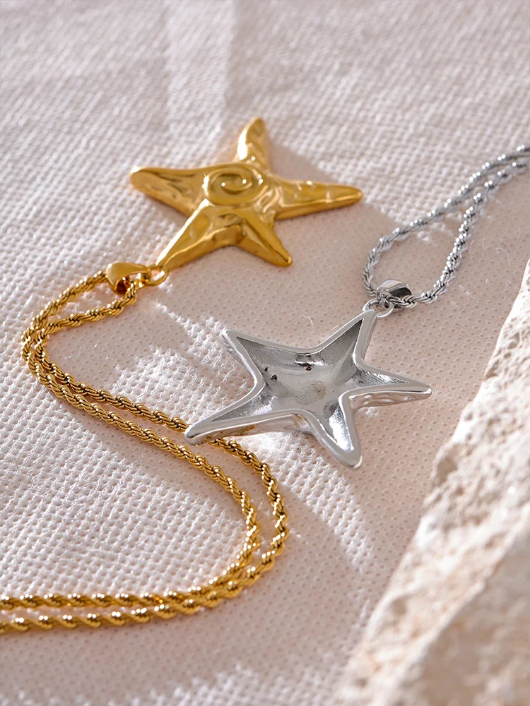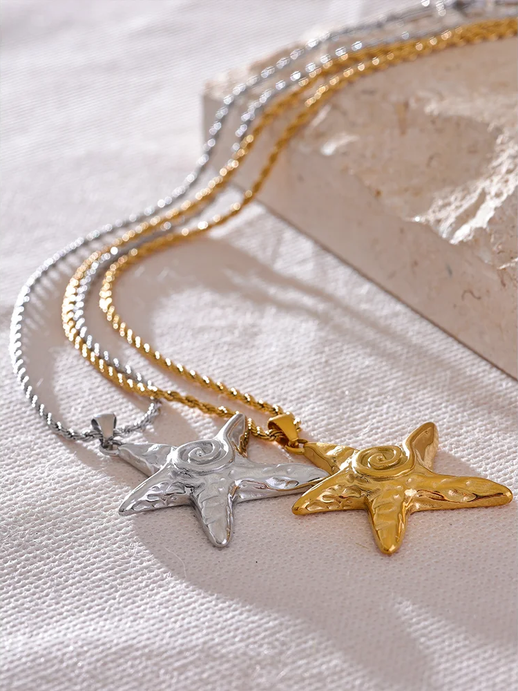 Crafted from durable 316L stainless steel, this star-shaped pendant necklace features a rust-proof finish with an 18K gold PVD plating option for long-lasting shine. The design showcases a textured surface with a spiral detail at the center, suspended on a twisted rope chain that complements its bold, individualistic style. Suitable for all occasions, this trendy pendant offers both gold and steel color options to match diverse looks.