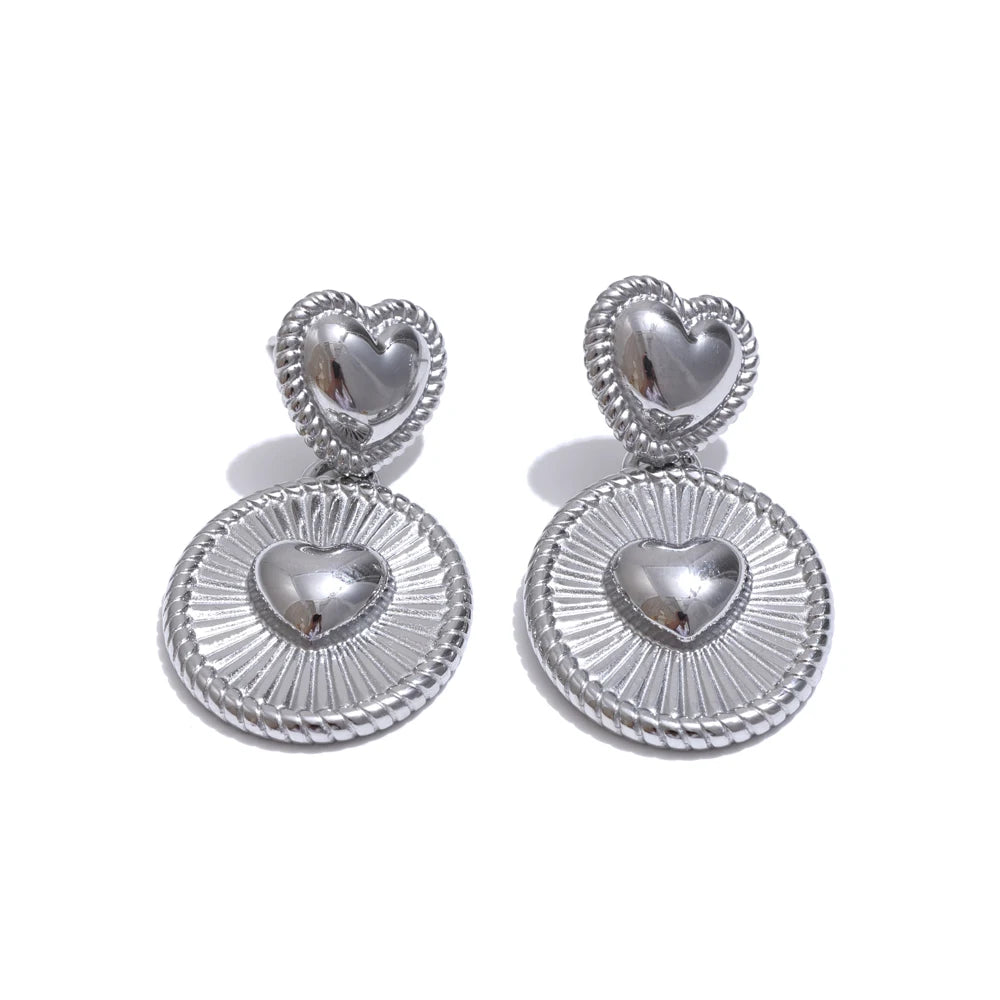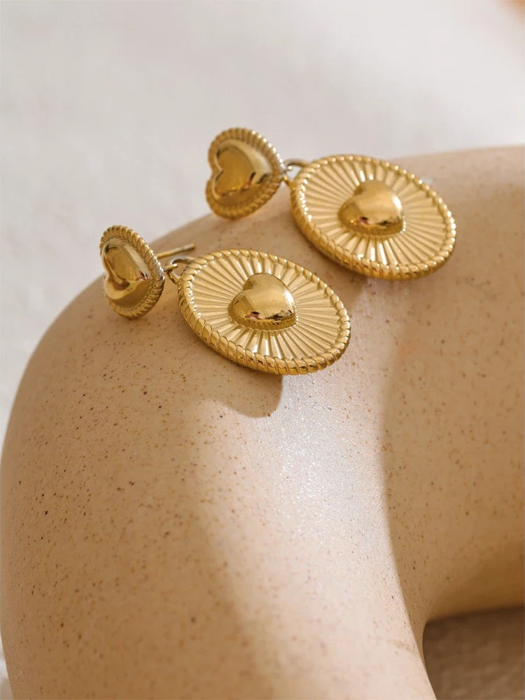 Elevate your everyday with these lightweight drop earrings, crafted from durable stainless steel and finished with high‑quality PVD gold plating. A sculpted heart motif meets a striped circular charm for a modern, romantic silhouette that feels fresh yet timeless.