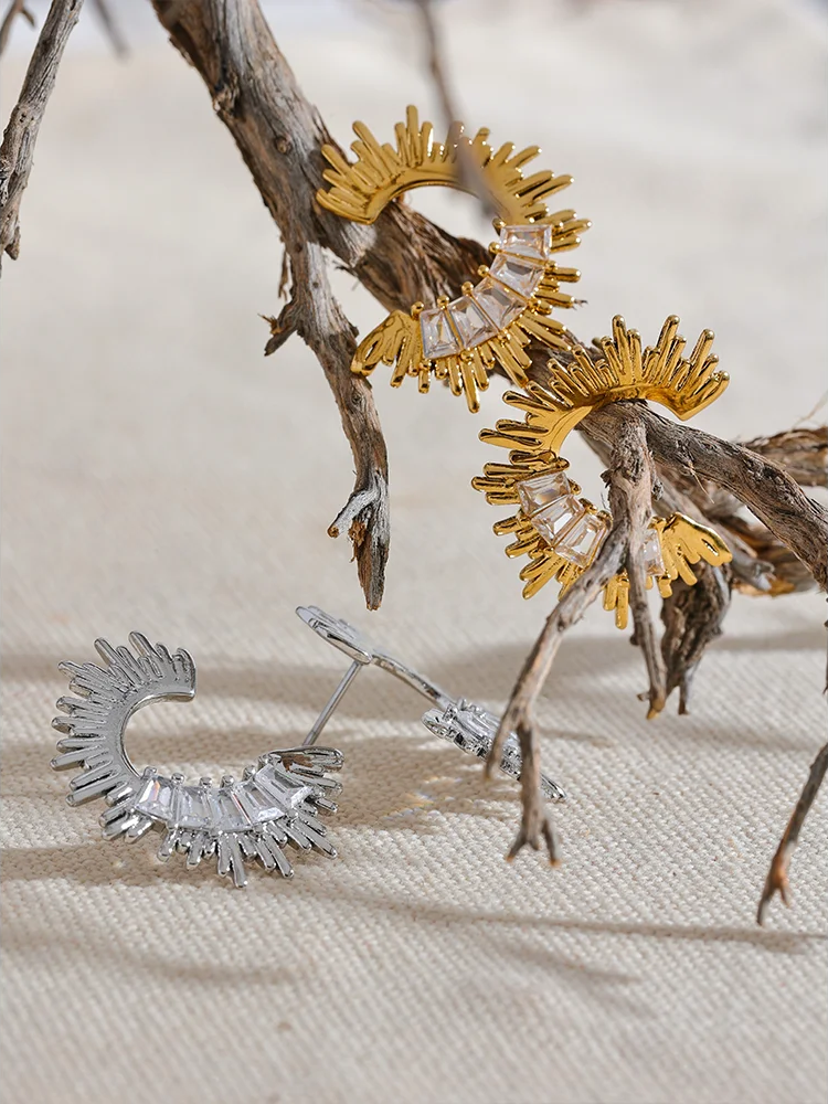 - Design: Sunburst-inspired studs with clean, modern geometry