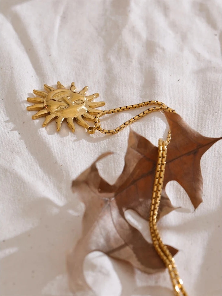 Crafted from durable stainless steel with a PVD real gold plating, this sun face pendant necklace blends contemporary design with lasting wearability. The geometric sun motif features a polished finish that resists tarnishing and is waterproof for everyday use. A versatile accessory, it complements various styles while providing a trendy, eye-catching detail. Suitable for all occasions, this necklace offers both fashion and function in one unique piece.