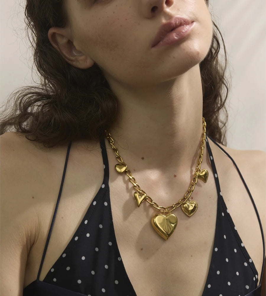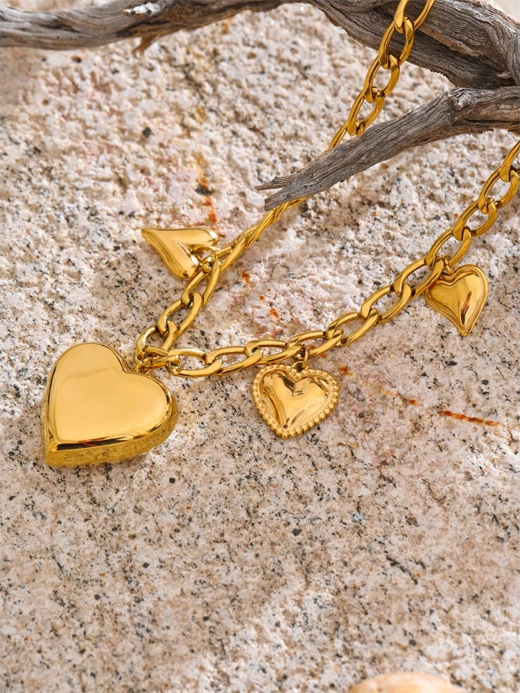 Crafted from thick stainless steel with a polished gold-tone finish, this pendant necklace features multiple heart-shaped charms that add dimension and style. The durable PVD real gold plating ensures lasting shine and water resistance, making it suitable for everyday wear. Designed with a trendy, chunky chain, it offers a bold yet elegant look perfect for complementing various outfits.