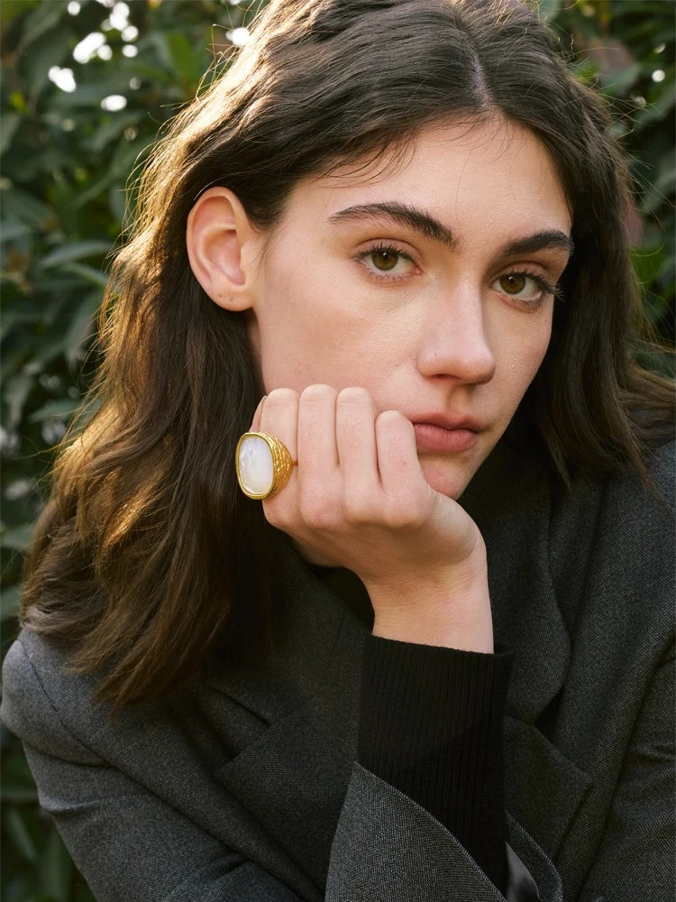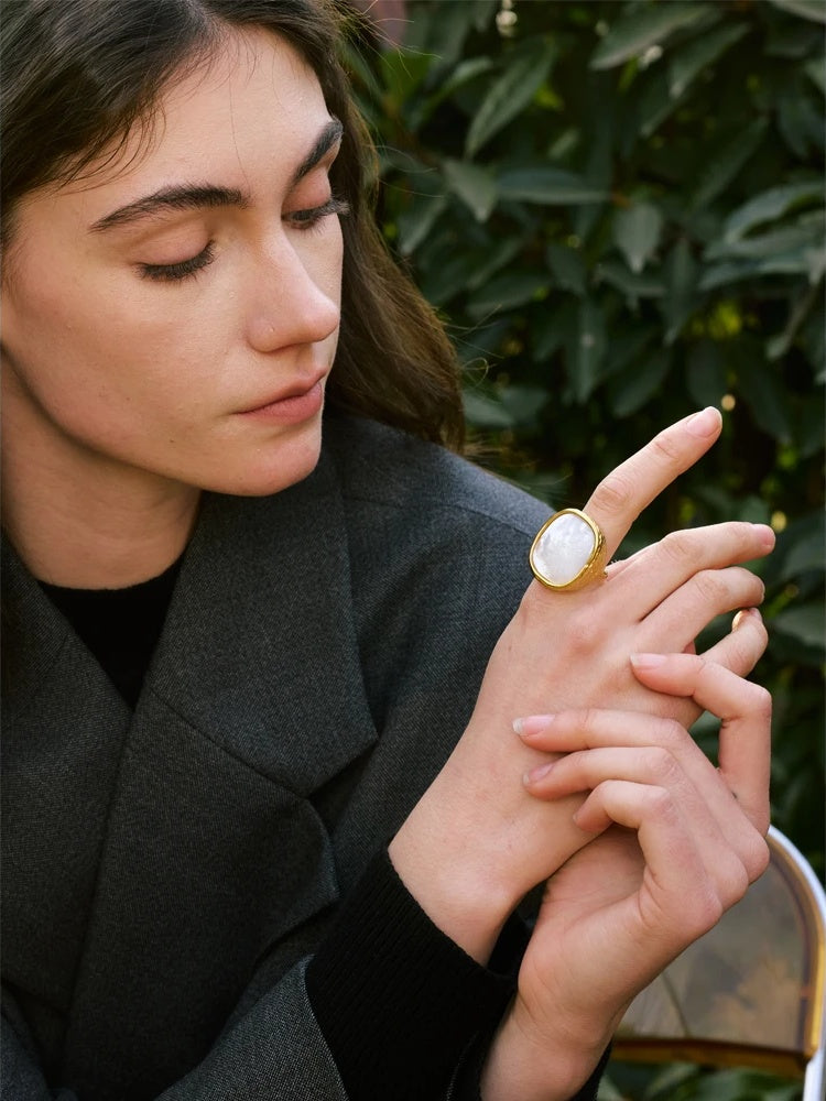 Crafted from durable stainless steel with an 18K gold PVD plating, this adjustable open ring features a bold, textured band that complements the large shell stone centerpiece. Its resizable design ensures a comfortable fit for all fingers, making it a versatile accessory for any occasion. The geometric shape adds a modern edge while maintaining a fashionable and elegant look. Ideal for those seeking a statement piece with lasting quality.