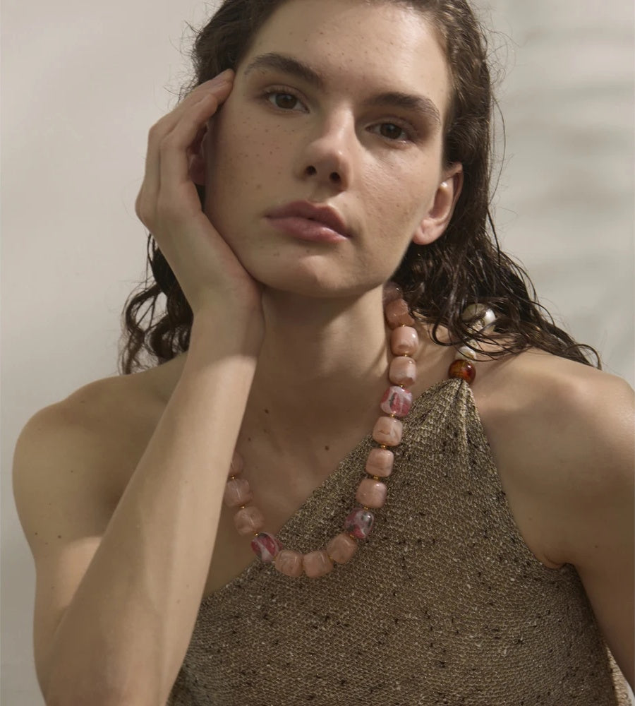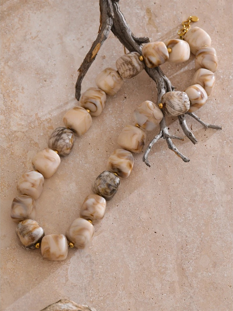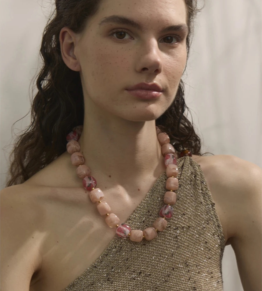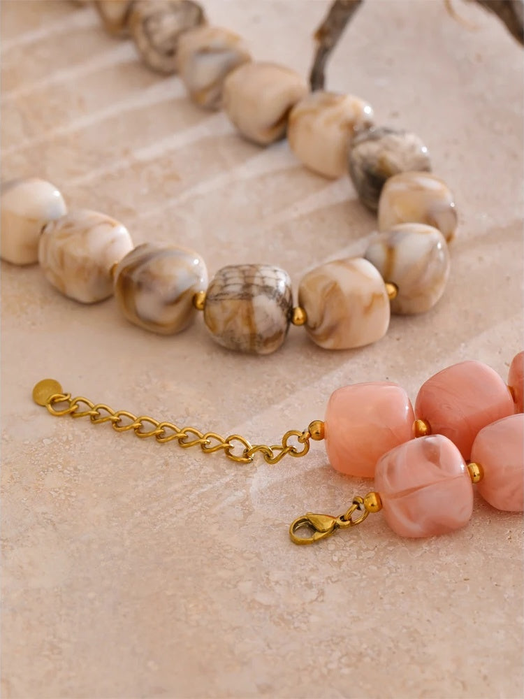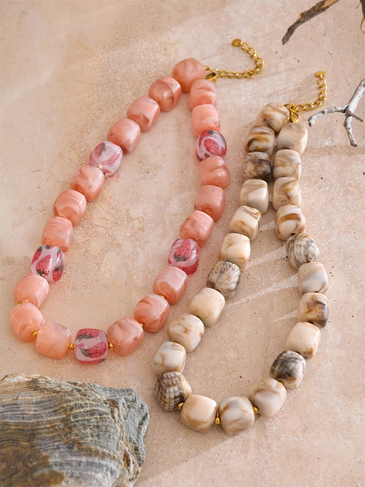 Crafted from acrylic beads with a square shape, this necklace features a blend of soft pink hues and delicate strawberry patterns for a playful yet stylish look. The chain is finished with a PVD real gold plating on stainless steel hardware, adding a subtle shine and durability. Designed to be waterproof, it is ideal for party wear and daily use without worrying about damage. Adjustable length ensures a comfortable fit, making it a versatile accessory for a trendy fashion statement.