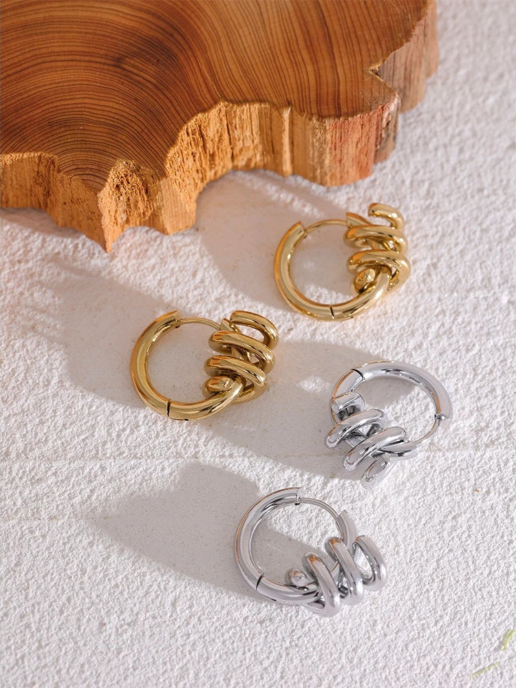 Crafted from durable stainless steel with a PVD gold plating, these twisted hoop earrings offer a stylish geometric design that stands out. Waterproof and resistant to tarnishing, they maintain their shine even with regular wear. Lightweight and comfortable, they provide a trendy accessory option suitable for everyday fashion. Available in gold and steel tones to complement various looks.