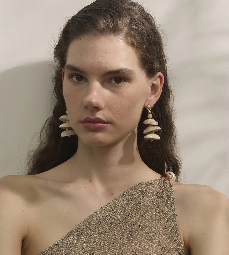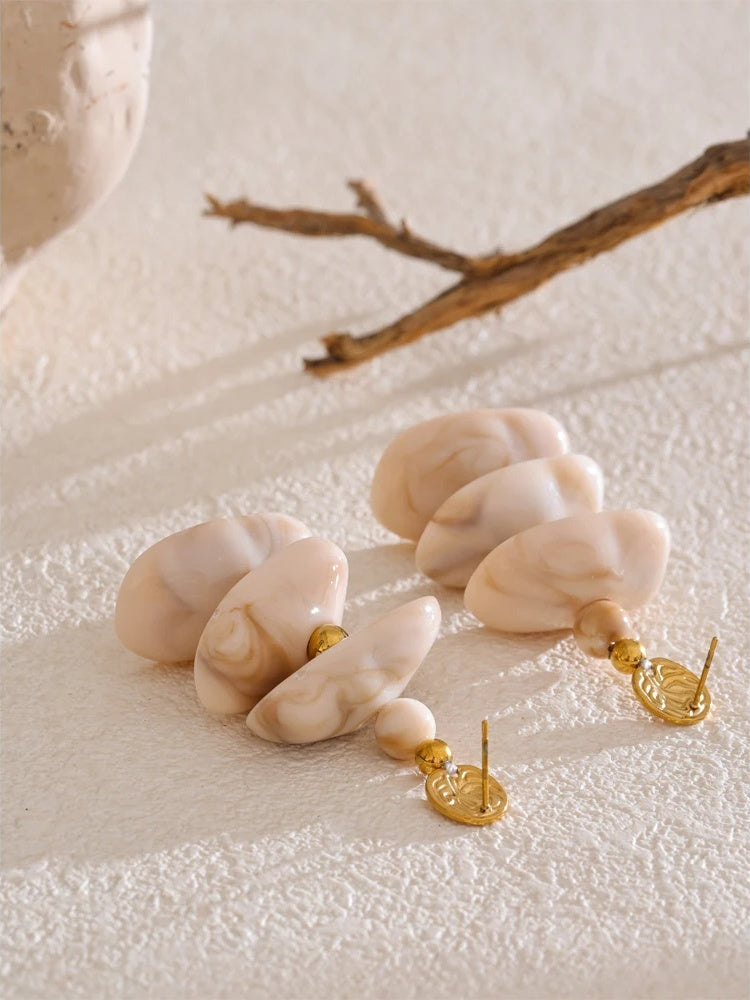 Lightweight drop earrings crafted from a combination of resin and stainless steel with a gold-tone finish. The geometric design features layered, irregular shapes that create a distinctive, sculptural look. Suitable for everyday wear or special occasions, these earrings offer a trendy and minimalist style. Hypoallergenic materials ensure comfort for sensitive skin.