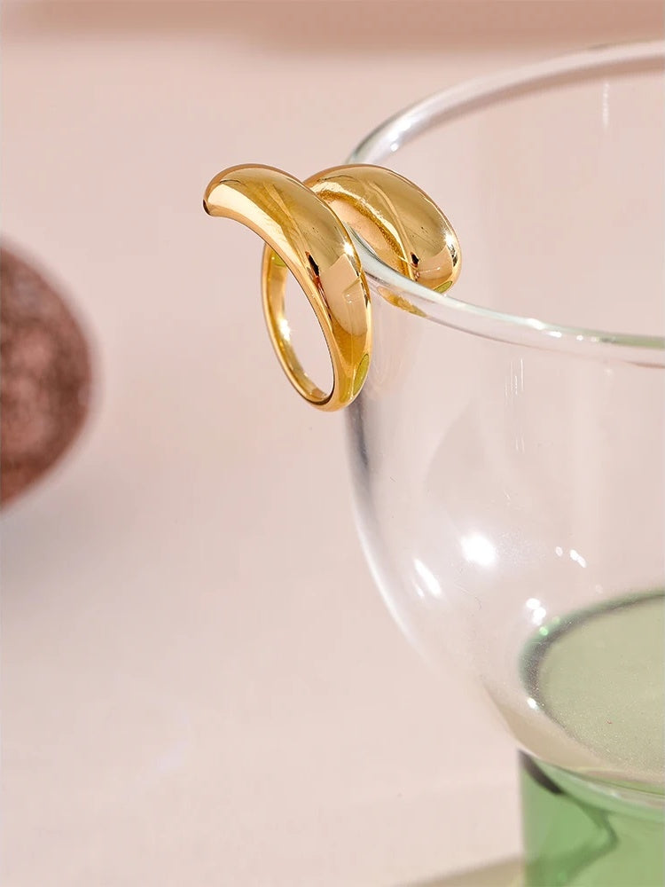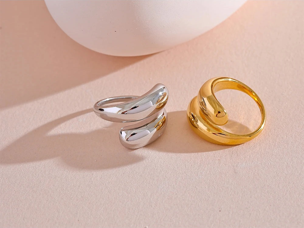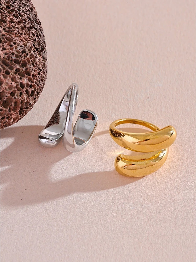 Crafted from durable stainless steel with an 18K PVD gold plating, this ring offers both shine and resilience. Its sleek, geometric design creates a unique, modern silhouette that stands out while maintaining minimalist appeal. Water-resistant and resizable, it adapts comfortably to different finger sizes and daily wear. Perfect for fashion-forward individuals seeking a stylish yet practical accessory.