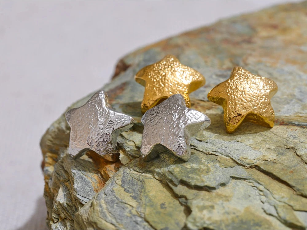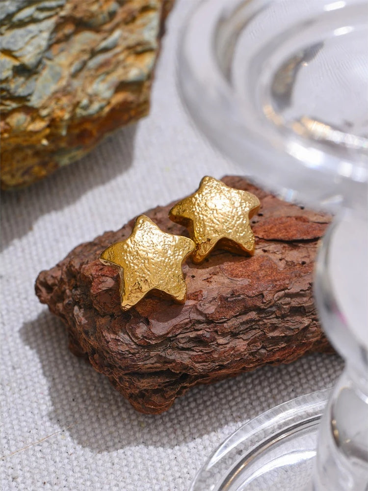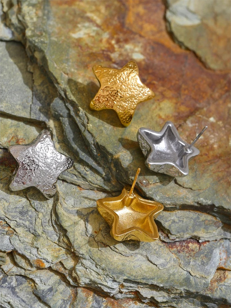 Elevate your everyday style with our star-shaped stud earrings, crafted from durable stainless steel and finished with a hand-textured, hammered surface. Their clean silhouette and subtle shimmer make these gold-plated earrings a modern classic—easy to dress up or down, and designed for confident, comfortable wear from day to night.