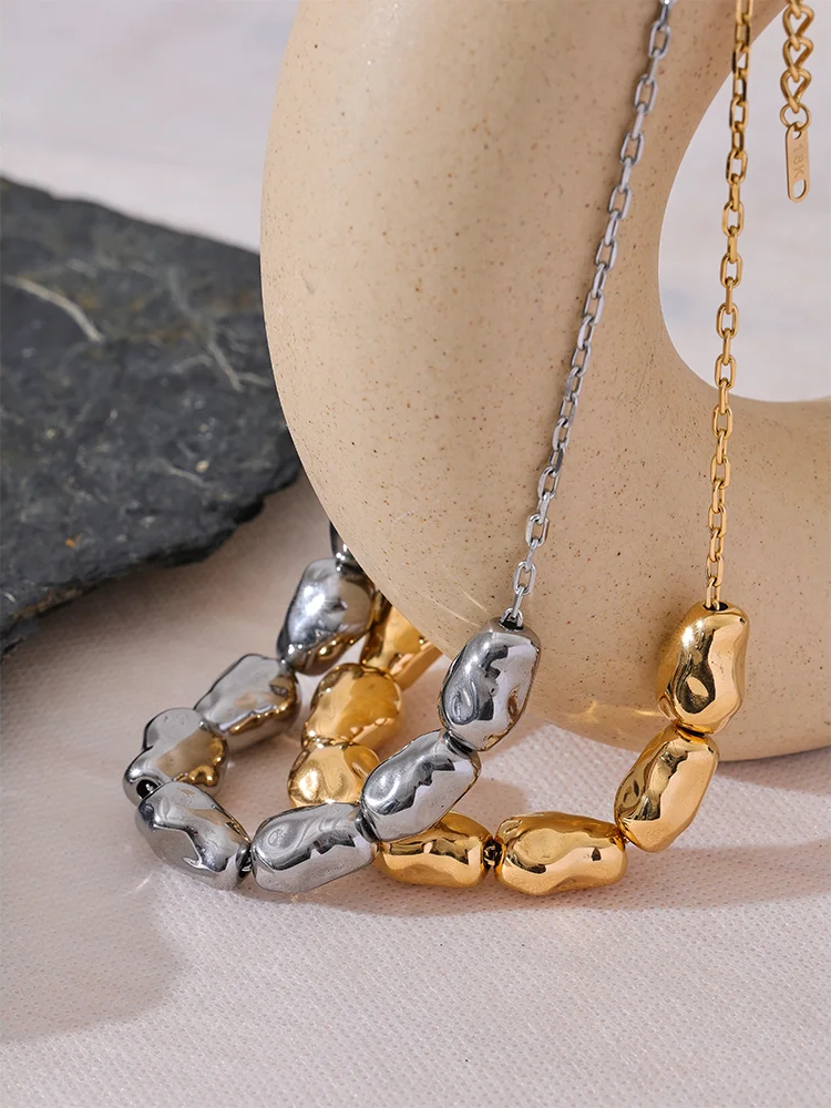 Elevate your everyday with a contemporary two-piece set that balances bold form and effortless wear. This coordinated necklace and bracelet feature sculptural, irregular geometric shapes, crafted in durable stainless steel and finished with high-quality PVD gold plating for a luminous, long-lasting shine. Designed to be waterproof, each piece stands up beautifully to daily life while maintaining its polished finish.
