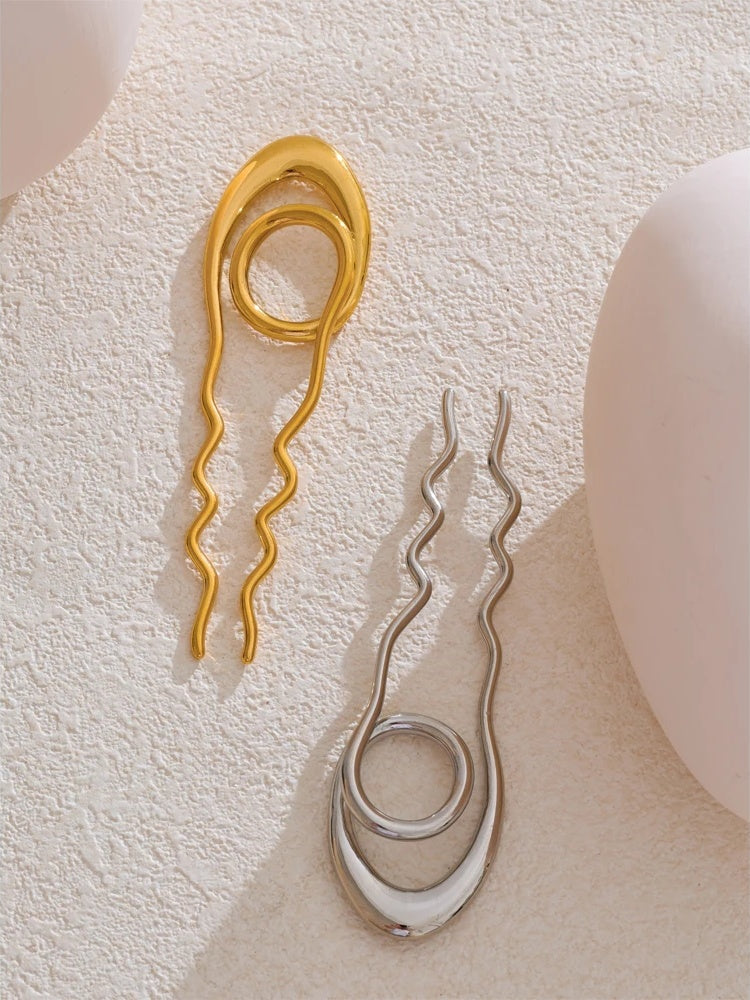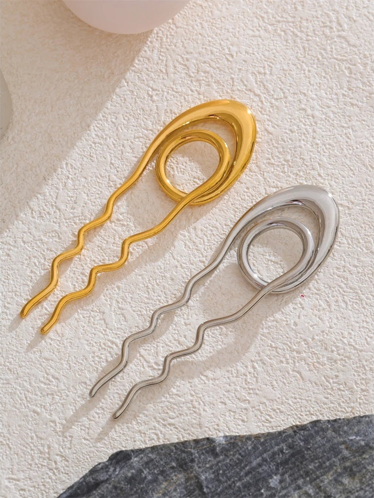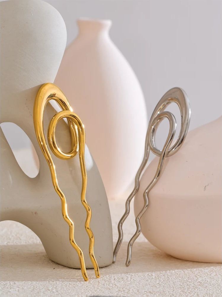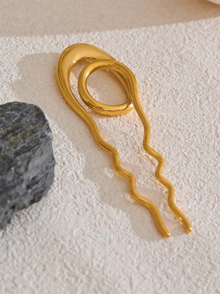 Crafted from stainless steel with a PVD real gold plating, this hairpin offers a waterproof and durable design. Its minimalist geometric shape adds a modern touch to any hairstyle, combining both style and function. Lightweight yet sturdy, it ensures a secure hold without damaging hair. Available in gold and silver tones to complement various looks and preferences.