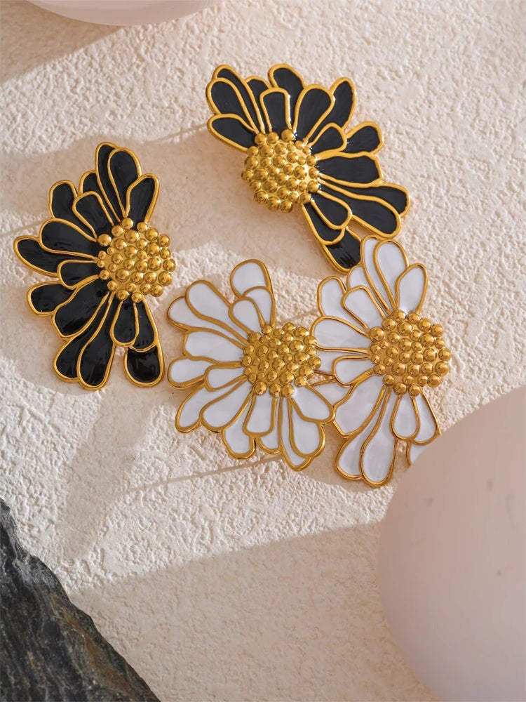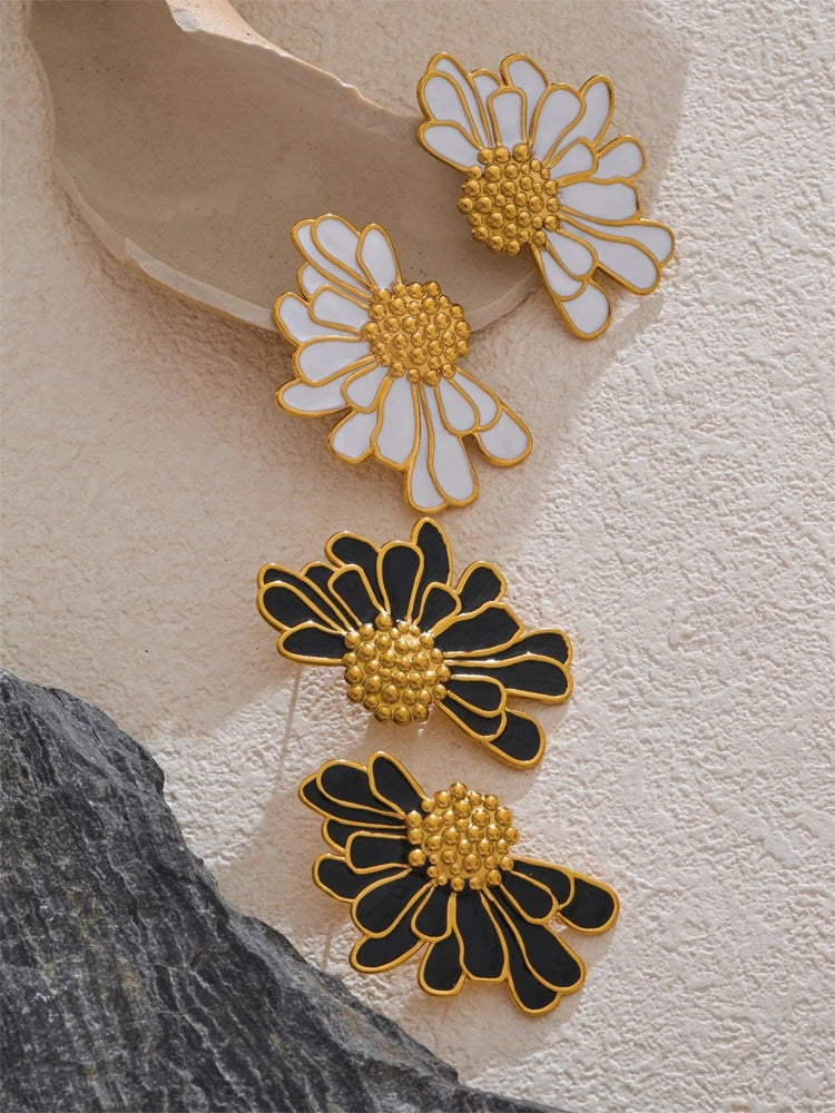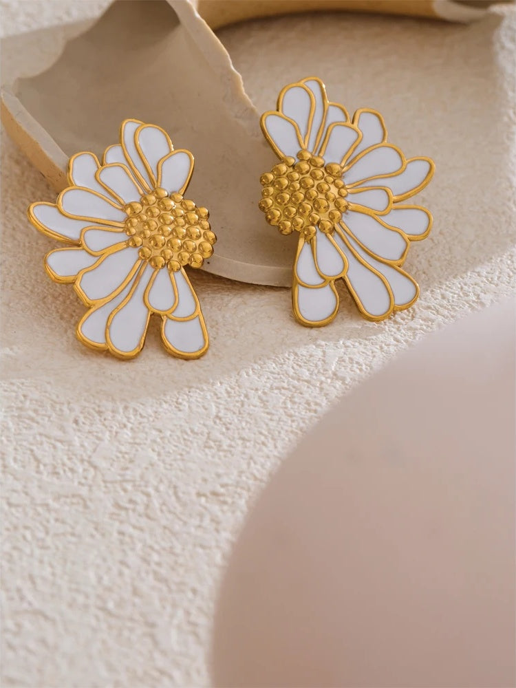 Crafted from stainless steel with a PVD real gold plating, these stud earrings feature a striking enamel flower design in crisp white. The intricate petals are outlined in gold, highlighting the textured center for a bold, geometric look. Secure push-back closures ensure comfortable and reliable wear. Perfect for women seeking a trendy statement accessory with lasting durability.