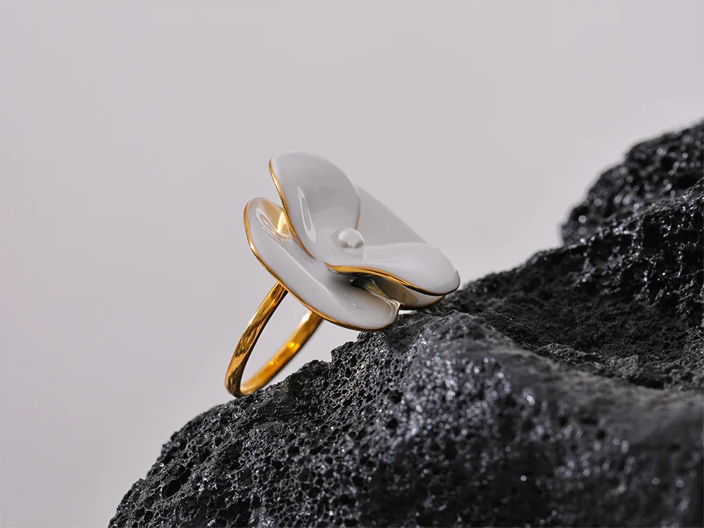 An adjustable ring featuring a white enamel flower design with delicate gold-tone edges for a refined look. Crafted from stainless steel with platinum plating, it offers durability and water resistance. The ring includes a simulated pearl centerpiece and is perfect for party occasions or everyday wear. Its trendy plant-inspired pattern adds a fashionable, feminine touch to any outfit.