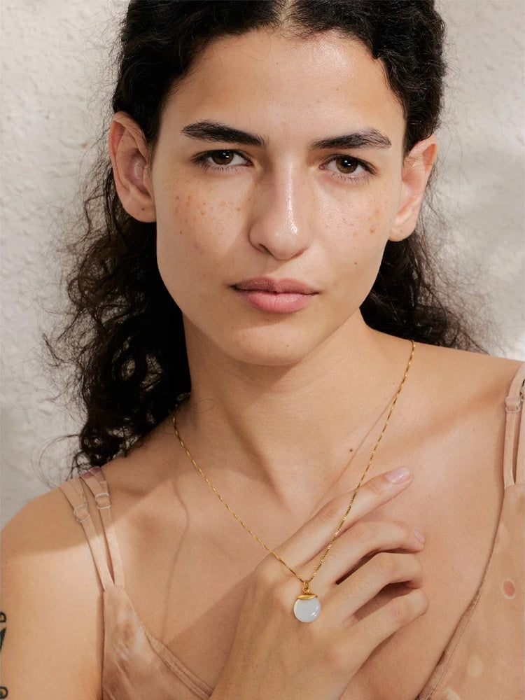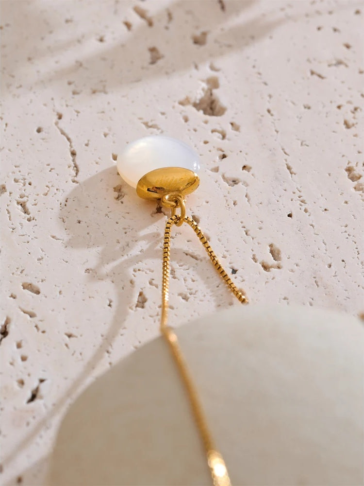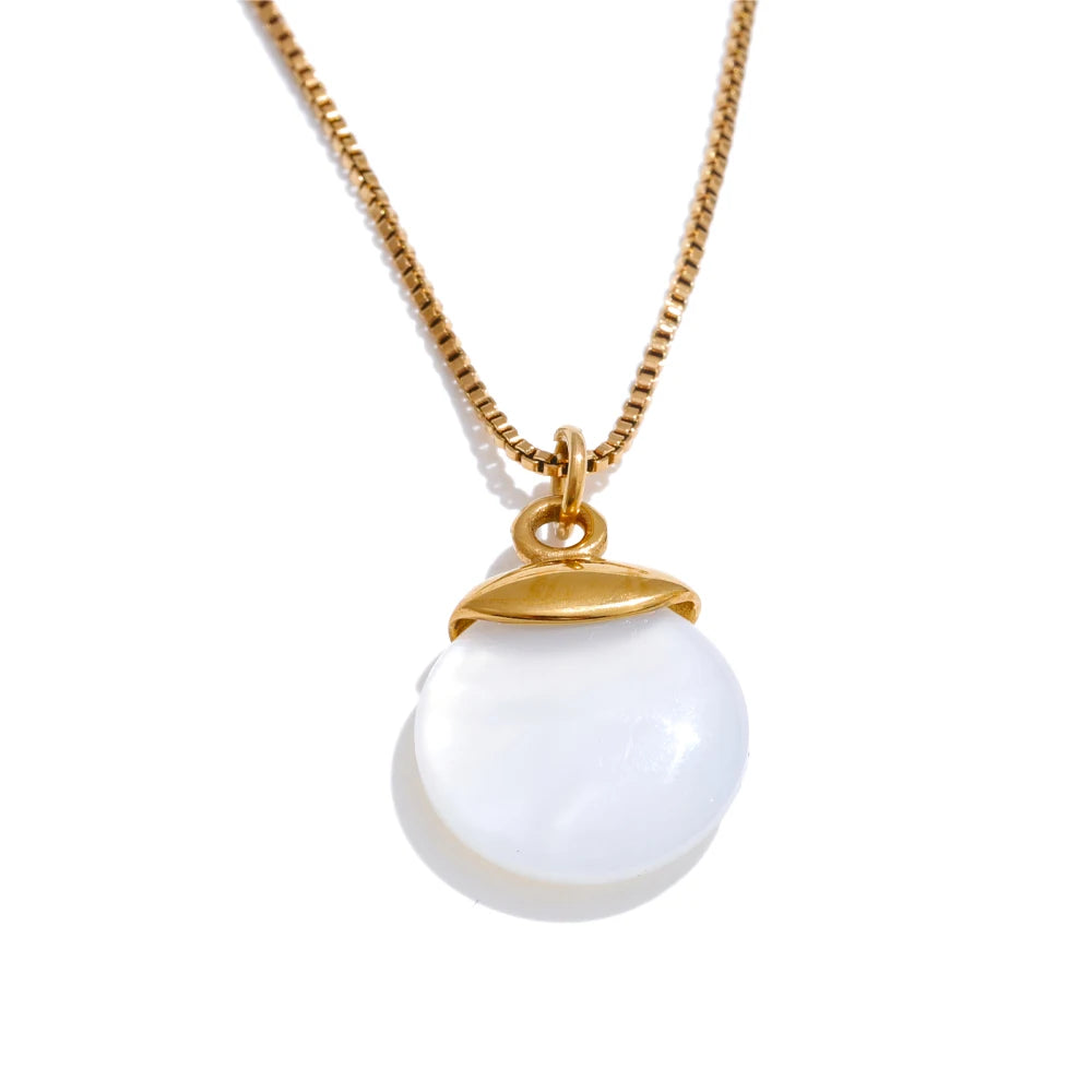 Refined and effortless, this round pendant necklace brings a touch of modern minimalism to every look. A natural white stone is smoothly set in durable stainless steel and finished in a polished gold-tone, creating a clean contrast that feels both timeless and on-trend. The pendant drapes from a fine, comfortable chain designed for everyday wear and special occasions alike. Hypoallergenic construction offers peace of mind for sensitive skin.