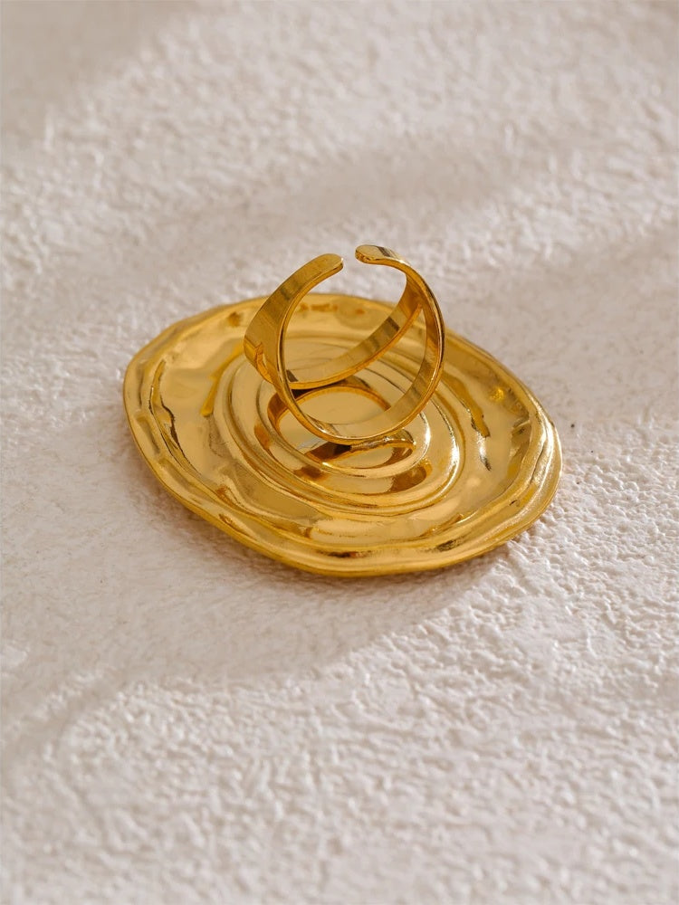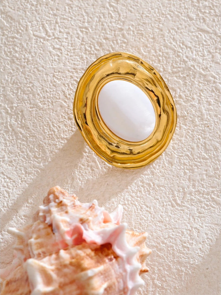 Oval-shaped with a smooth white shell center, this adjustable ring is crafted from durable stainless steel with 18k gold plating for a lustrous finish. Its unique geometric design adds a contemporary edge, while the resizable band ensures a comfortable fit for any finger. Resistant to rust and everyday wear, it combines lasting quality with modern style.