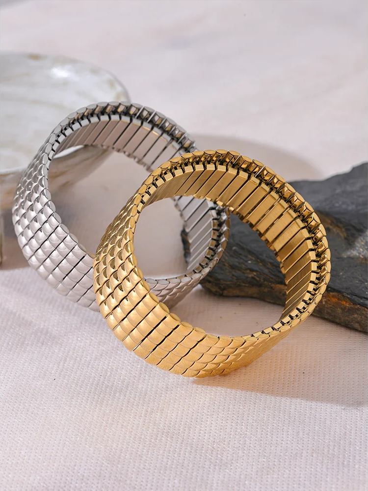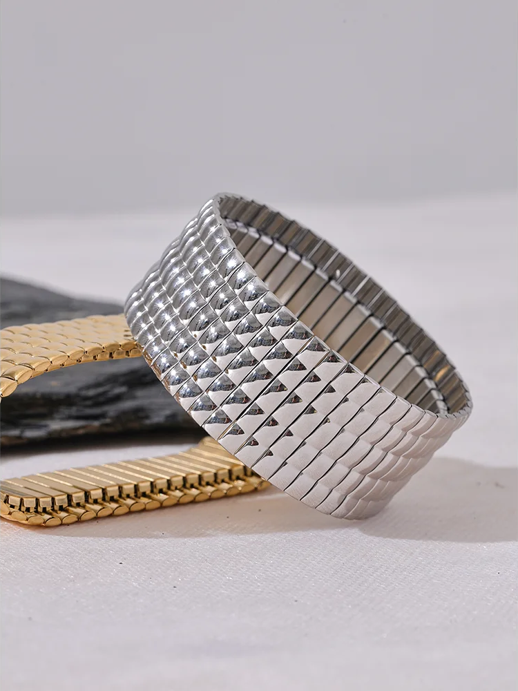 Modern and effortlessly polished, this wide bangle bracelet is crafted from high-quality stainless steel and finished with 18K PVD gold for a rich, long‑lasting shine. A sleek geometric profile gives it a bold, contemporary edge, while the smooth, polished surface feels refined against the skin. The elastic, stretch-fit construction offers comfortable flexibility across a wide range of wrist sizes—easy on, easy off, and made for everyday wear.