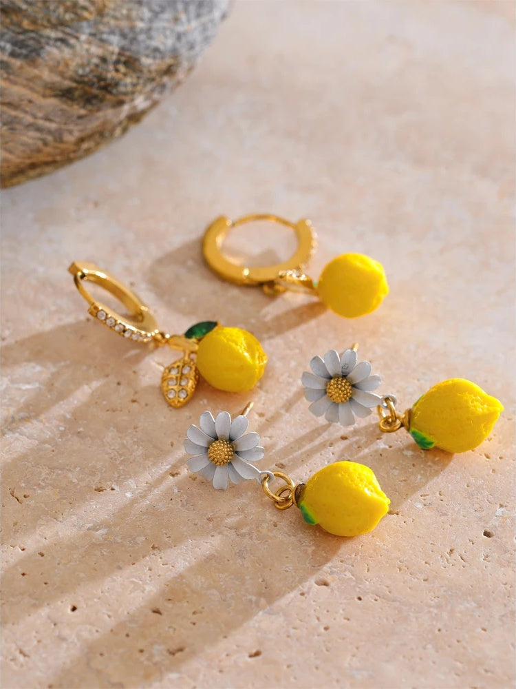 Vibrant yellow resin lemons paired with sparkling cubic zirconia accents create a playful yet elegant look in these dangle earrings. Crafted from durable stainless steel with a gold-colored plating, each piece features intricate leaf details for added charm. Lightweight and comfortable, they offer a trendy geometric style perfect for everyday wear or special occasions.