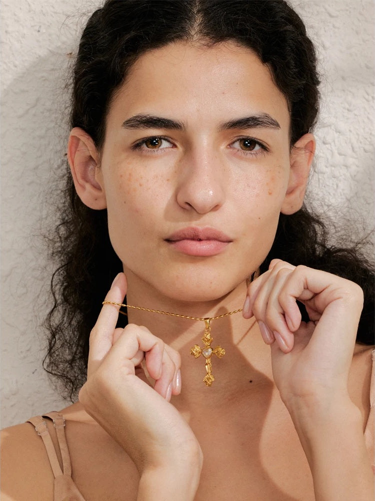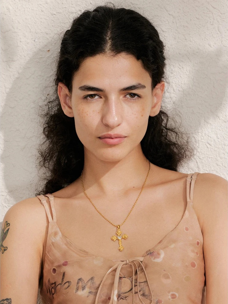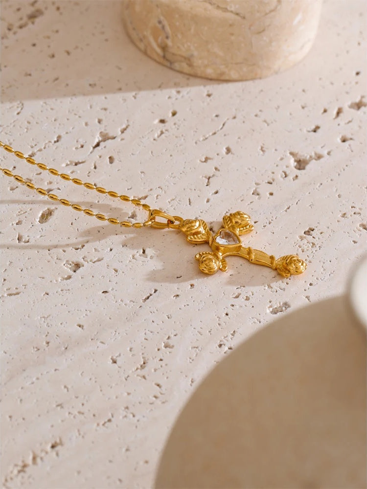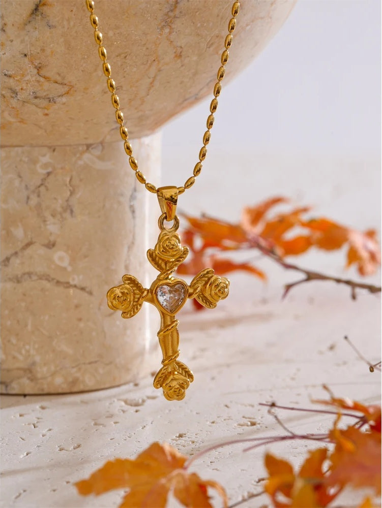 Crafted from stainless steel and finished with an 18K PVD gold plating, this pendant features a detailed cross design adorned with rose-shaped accents. A sparkling cubic zirconia centerpiece adds a refined touch to the floral motif. Durable and hypoallergenic, it is compatible with all chain types and suitable for everyday wear. The trendy aesthetic makes it a versatile addition to any jewelry collection.