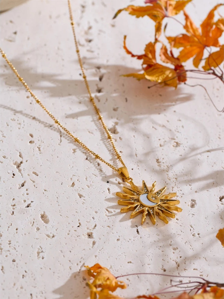 Crafted from stainless steel with a PVD real gold plating, this pendant necklace features an intricate sun and moon design detailed with shell inlay and sparkling zircon accents. The 50+6 cm chain length offers adjustable comfort, making it suitable for various styles and occasions. Its trendy celestial motif adds a unique and fashionable touch to any outfit. Designed to be compatible with all, this necklace is both durable and stylish.