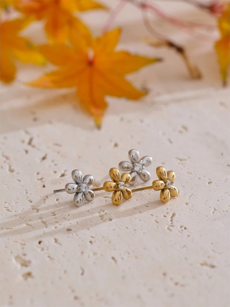 Crafted from stainless steel with a polished finish, these flower-shaped stud earrings feature a sparkling cubic zirconia center for a delicate touch of elegance. Designed with a secure push-back closure, they offer comfortable all-day wear. Available in both gold and platinum tones, these versatile earrings complement a variety of styles and occasions.